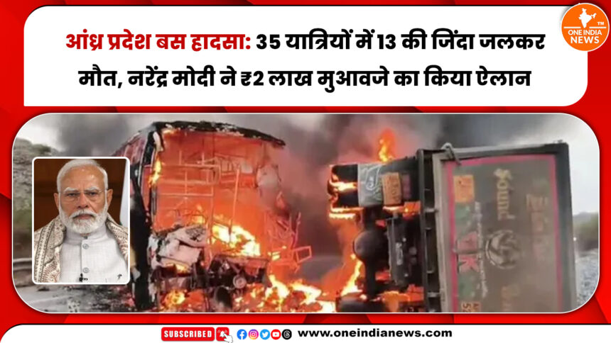 आंध्र प्रदेश के मरकापुरम जिले में गुरुवार (26 मार्च 2026) सुबह एक दिल दहला देने वाला सड़क हादसा हुआ। रायवरम के पास एक प्राइवेट ट्रेवल्स बस और डंपर की टक्कर के बाद बस में भीषण आग लग गई, जिसमें 13 यात्रियों की जिंदा जलकर मौत हो गई।