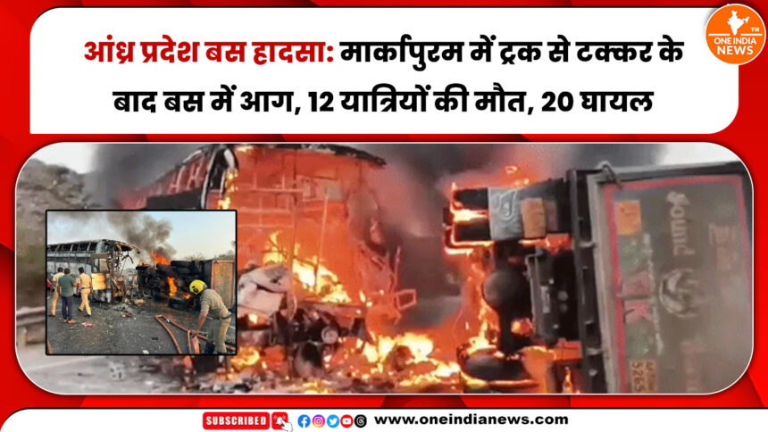 आंध्र प्रदेश के मार्कापुरम के पास गुरुवार तड़के एक भीषण सड़क हादसे में निजी ट्रैवल बस में आग लगने से कम से कम 12 यात्रियों की मौत हो गई, जबकि करीब 20 लोग घायल हो गए। हादसा सुबह करीब 5:45 बजे हुआ।
