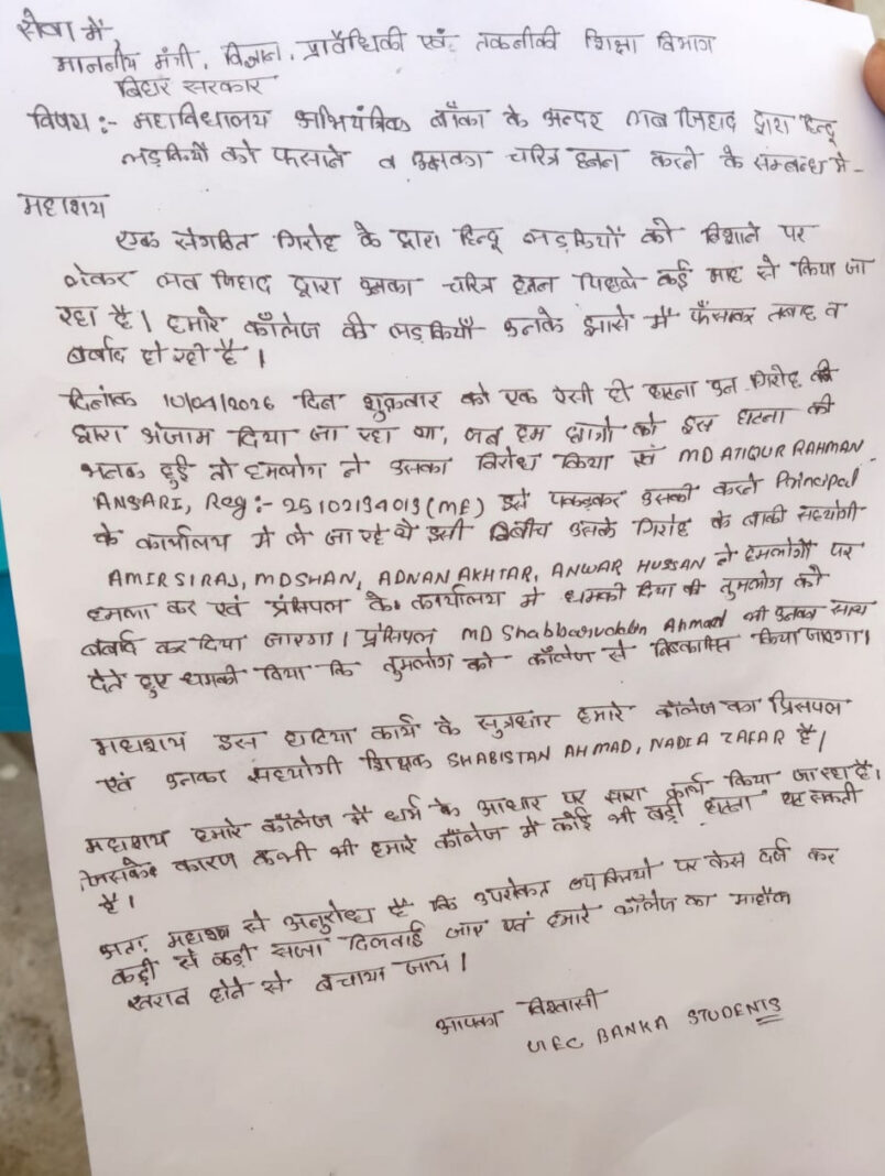 बिहार के बांका स्थित एक इंजीनियरिंग कॉलेज में हाल ही में बड़ा विवाद सामने आया है। कॉलेज के एक छात्र अतीकुर रहमान अंसारी पर एक छात्रा को लेकर आपत्तिजनक स्थिति में पाए जाने और उसके बाद हुए विवाद को लेकर गंभीर आरोप लगे हैं। इस घटना के बाद परिसर में तनाव बढ़ गया और छात्रों ने जोरदार विरोध प्रदर्शन किया।