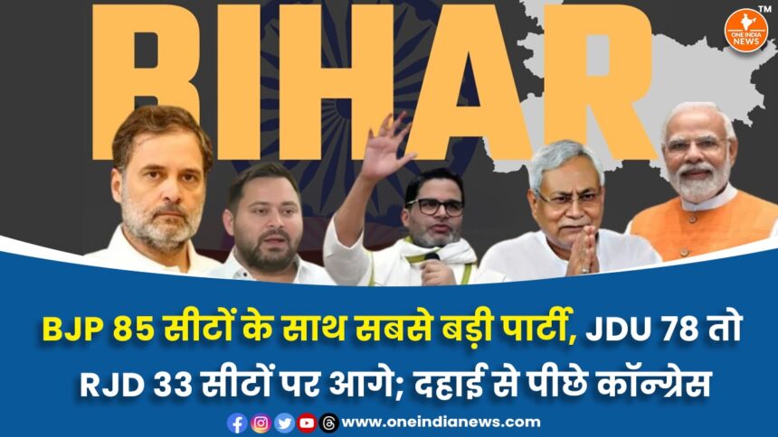 बिहार विधानसभा चुनाव 2025 की मतगणना तेजी से आगे बढ़ रही है और शुरुआती रुझानों ने यह साफ कर दिया है कि मुकाबला रोमांचक होने वाला है। निर्वाचन आयोग की वेबसाइट पर उपलब्ध ताज़ा आँकड़ों के अनुसार शुरुआती 238 सीटों के रुझानों में सत्ता पक्ष यानी एनडीए मजबूत स्थिति में दिखाई दे रहा है। इन रुझानों में भारतीय जनता पार्टी (BJP) 85 सीटों पर आगे चल रही है, जो उसे अब तक की सबसे बड़ी पार्टी के रूप में स्थापित करता है। वहीं, मुख्यमंत्री नीतीश कुमार की जनता दल यूनाइटेड (JDU) भी 78 सीटों पर बढ़त बनाए हुए है, जिससे गठबंधन की स्थिति और मजबूत हो रही है। चिराग पासवान के नेतृत्व वाली लोक जनशक्ति पार्टी (रामविलास) इस बार अप्रत्याशित प्रदर्शन करती दिख रही है और 22 सीटों पर आगे है, जो गठबंधन की कुल ताकत में बड़ा योगदान साबित हो सकता है।