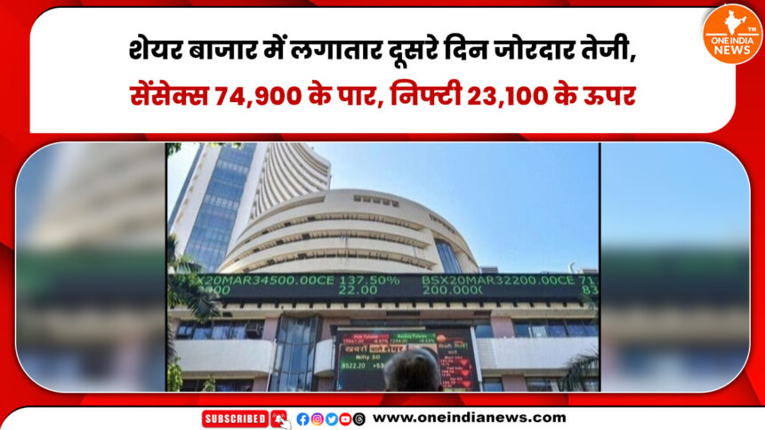 भारतीय शेयर बाजार में तेजी का सिलसिला लगातार दूसरे दिन भी जारी रहा। बुधवार सुबह शुरुआती कारोबार में BSE Sensex करीब 1.15% यानी 854 अंकों की बढ़त के साथ 74,922 के स्तर पर कारोबार करता दिखा। वहीं Nifty 50 भी 1.14% या 275 अंकों की तेजी के साथ 23,185 के पार पहुंच गया।