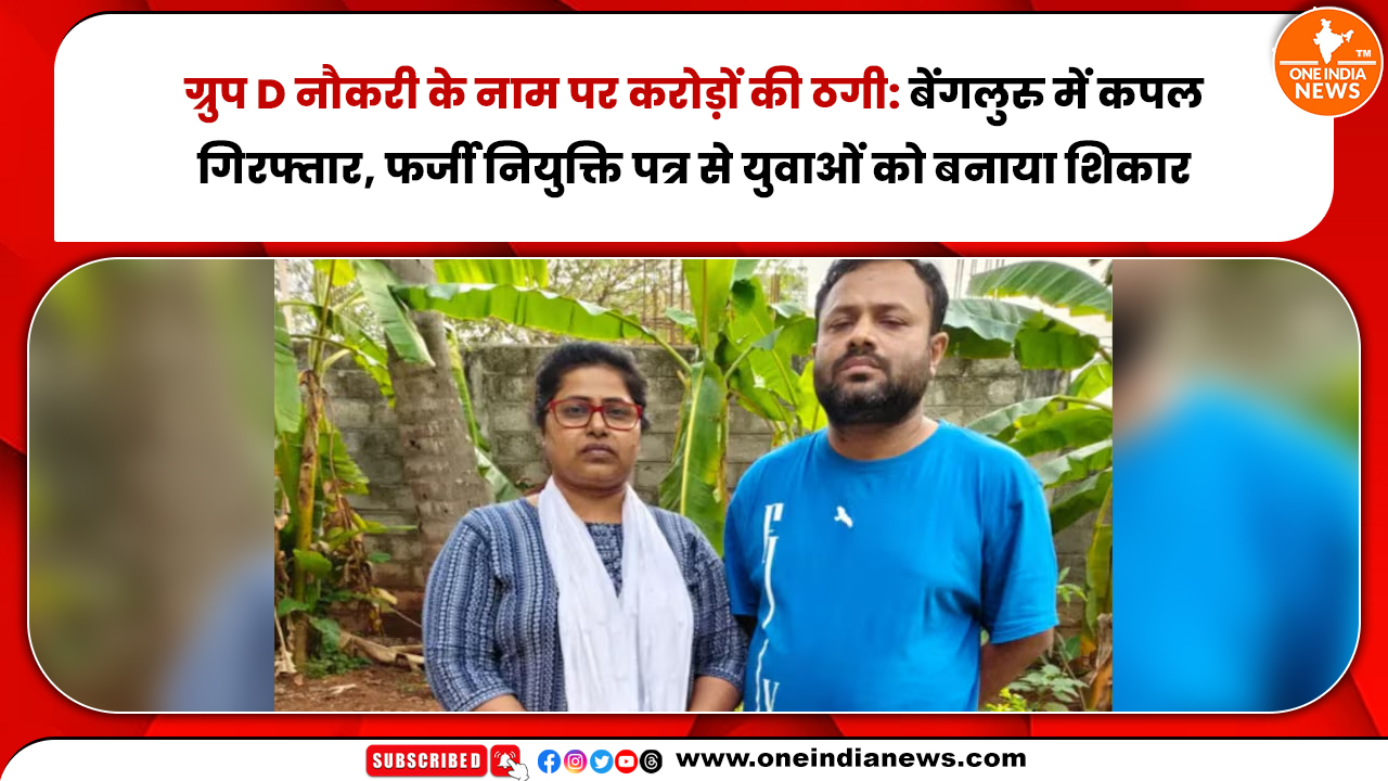 Bengaluru में सरकारी नौकरी दिलाने के नाम पर बड़े फर्जीवाड़े का खुलासा हुआ है। ग्रुप D की नौकरी का झांसा देकर एक कपल ने सैकड़ों युवाओं से करोड़ों रुपये ठग लिए। पुलिस ने इस मामले में आरोपी कपल को गिरफ्?...