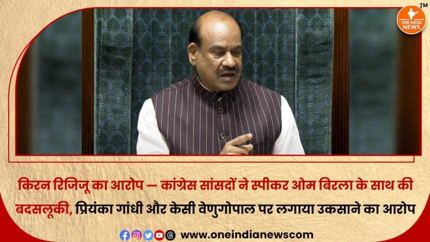 केंद्रीय मंत्री किरन रिजिजू ने कांग्रेस सांसदों पर गंभीर आरोप लगाते हुए कहा है कि लोकसभा स्पीकर ओम बिरला के साथ बदसलूकी और अभद्र व्यवहार किया गया। रिजिजू के मुताबिक, प्रियंका गांधी और केसी वेणुगोपाल के कथित उकसावे पर कांग्रेस के 20-25 सांसद स्पीकर के चेंबर में घुस गए और गाली-गलौज की।