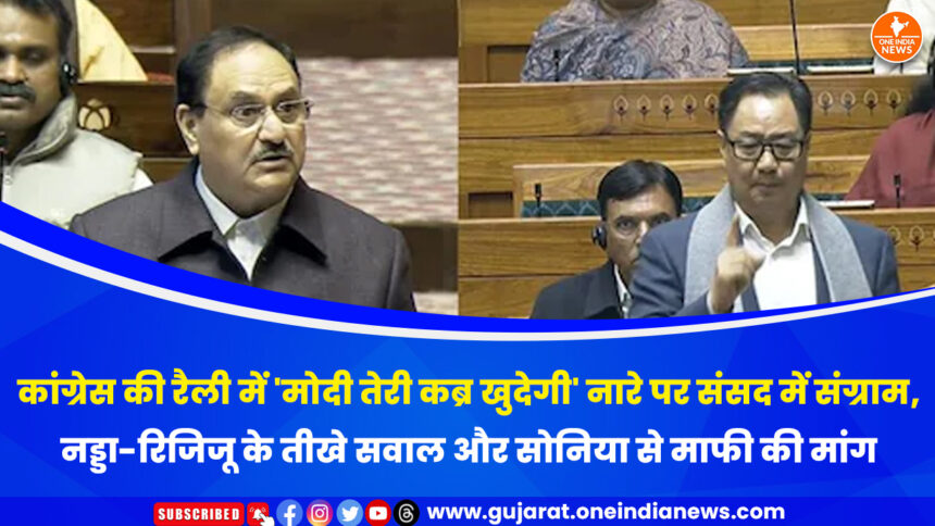 कांग्रेस की एक रैली में प्रधानमंत्री नरेंद्र मोदी को लेकर लगाए गए “कब्र खोदने” वाले नारे पर सोमवार को संसद में जबरदस्त हंगामा देखने को मिला। इस मुद्दे को लेकर भारतीय जनता पार्टी ने कांग्रेस पर तीखा हमला बोला और दोनों सदनों में माहौल गर्म रहा।