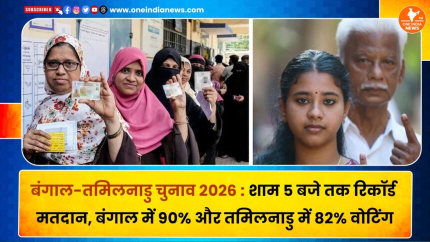 देश के दो बड़े राज्यों पश्चिम बंगाल और तमिलनाडु में विधानसभा चुनाव के पहले चरण में भारी मतदान दर्ज किया गया है। शाम 5 बजे तक पश्चिम बंगाल में लगभग 90% और तमिलनाडु में करीब 82% वोटिंग रिकॉर्ड की गई, जो मतदाताओं के उत्साह को दर्शाता है।