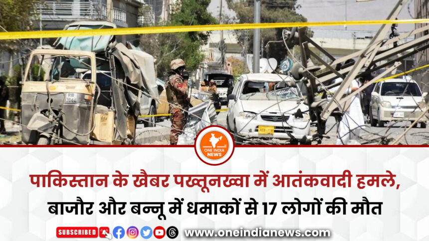 पाकिस्तान के खैबर पख्तूनख्वा प्रांत में 17 फरवरी 2026 को हुए अलग-अलग आतंकवादी हमलों में सुरक्षा बलों और नागरिकों को निशाना बनाया गया। बाजौर और बन्नू जिलों में हुए बम धमाकों में कुल 14 जवानों और 3 नागरिकों की मौत हो गई, जबकि कई लोग घायल बताए जा रहे हैं। सुरक्षा एजेंसियों ने इलाके में हाई अलर्ट जारी कर दिया है और सर्च ऑपरेशन शुरू कर दिया गया है।