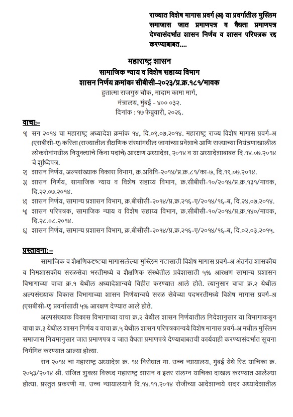 फडणवीस सरकार ने 17 फरवरी 2026 को आदेश जारी करते हुए कहा कि 2014 में लागू की गई सामाजिक और शैक्षणिक रूप से कमजोर मुस्लिमों (Socially and Educationally Backward Muslims) के लिए आरक्षण व्यवस्था अब समाप्त हो गई है।