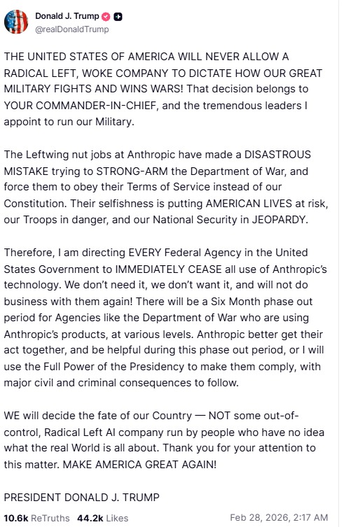 राष्ट्रपति ट्रंप ने अपने सोशल मीडिया प्लेटफॉर्म Truth Social पर कड़े शब्दों में कहा कि अमेरिकी सरकार की सभी एजेंसियां एंथ्रोपिक की तकनीक का इस्तेमाल तुरंत बंद करें।