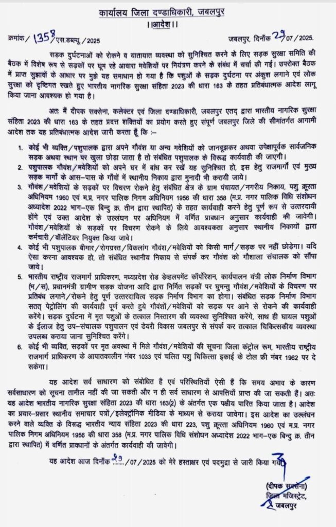 मंगलवार को जिला दण्डाधिकारी एवं कलेक्टर दीपक सक्सेना ने आवारा मवेशियों से उत्पन्न हो रही सड़क दुर्घटनाओं पर अंकुश लगाने हेतु भारतीय नागरिक सुरक्षा संहिता 2023 की धारा 163 के तहत प्रतिबंधात्मक आदेश जारी किया था। आदेश के मुताबिक, कोई भी व्यक्ति या पशुपालक अपने मवेशियों को सड़कों पर खुला नहीं छोड़ सकता। उल्लंघन करने पर कार्रवाई का प्रावधान भी जोड़ा गया था।