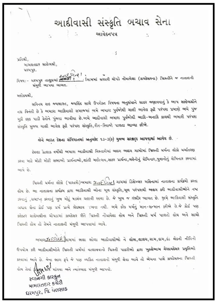 गुजरात के वलसाड जिले के धरमपुर और कपराड़ा तालुक के कई गाँवों में अवैध धर्मांतरण और धार्मिक प्रचार गतिविधियों को लेकर स्थानीय लोगों ने गंभीर चिंता जताई है। इसी मुद्दे को लेकर पिछले कुछ दिनों में इन इलाकों के हिंदू ग्रामीणों ने मामलतदार कार्यालय में आवेदन सौंपे हैं। ग्रामीणों की मांग है कि 25 दिसंबर को क्रिसमस मनाने की अनुमति केवल उन्हीं लोगों को दी जाए, जिनका नाम सरकारी रिकॉर्ड में आधिकारिक रूप से ईसाई धर्म के अनुयायी के रूप में दर्ज है।