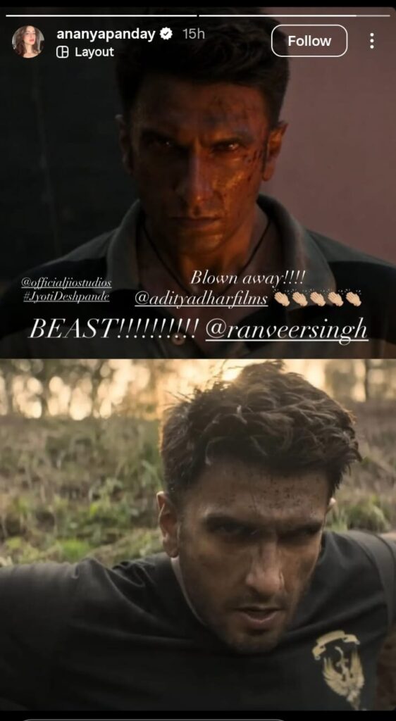 अनन्या ने लिखा: “आदित्य धर, मैं दंग रह गई! रणवीर सिंह कमाल के हैं!”