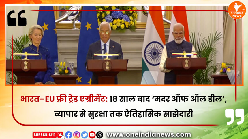 भारत और यूरोपीय संघ (EU) ने मंगलवार, 27 जनवरी 2026 को वैश्विक व्यापार के इतिहास में एक नया अध्याय जोड़ दिया। करीब 18 वर्षों की लंबी बातचीत के बाद नई दिल्ली के हैदराबाद हाउस में भारत-EU मुक्त व्यापार समझौते (FTA) पर आधिकारिक हस्ताक्षर हुए। प्रधानमंत्री नरेंद्र मोदी ने इसे भारत के व्यापारिक इतिहास का सबसे बड़ा और सबसे अहम समझौता बताया। इस डील से 27 यूरोपीय देशों के बाजार भारतीय उत्पादों के लिए खुलेंगे और आम लोगों के लिए लग्जरी कारों, विदेशी वाइन और कैंसर की दवाओं जैसी कई चीजें सस्ती होंगी।