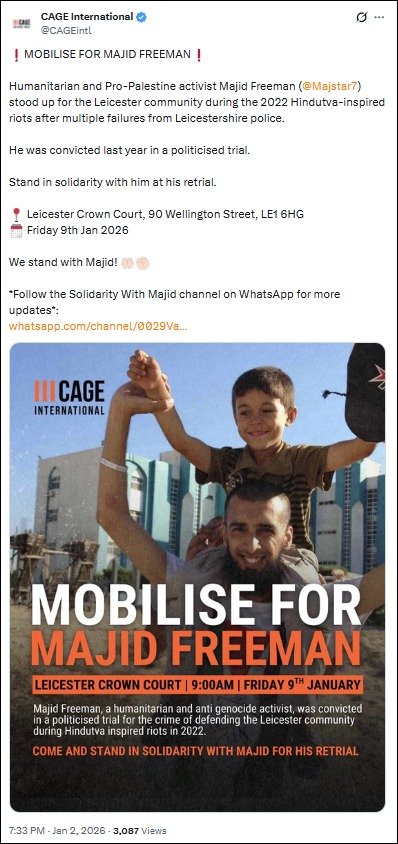 अब 9 जनवरी को होने वाले माजिद फ्रीमैन के दोबारा ट्रायल से पहले CAGE International लेस्टर क्राउन कोर्ट के बाहर लोगों को जुटाने की अपील कर रहा है। जानकारों का मानना है कि यह ‘एकजुटता’ नहीं, बल्कि अदालती प्रक्रिया को प्रभावित करने की कोशिश और शक्ति प्रदर्शन है।