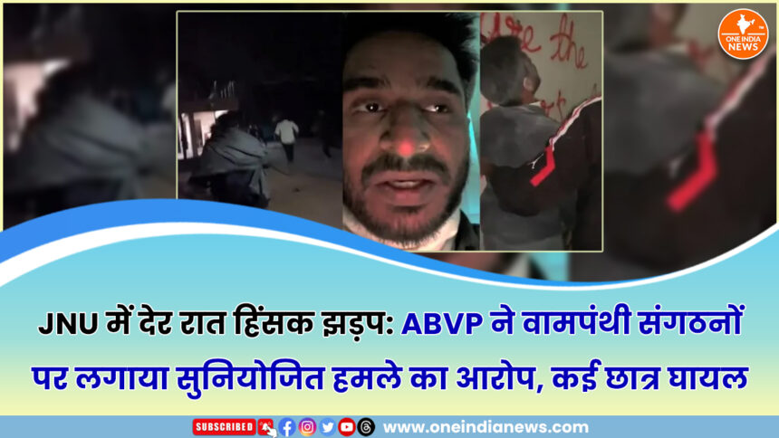 Jawaharlal Nehru University (JNU) परिसर में रविवार (22 फरवरी 2026) देर रात हिंसक झड़प की गंभीर घटना सामने आई है। Akhil Bharatiya Vidyarthi Parishad (ABVP) ने आरोप लगाया है कि वामपंथी संगठनों से जुड़े तत्वों ने उनके कार्यकर्ताओं और छात्रों पर सुनियोजित हमला किया, जिसमें कई छात्र गंभीर रूप से घायल हो गए।