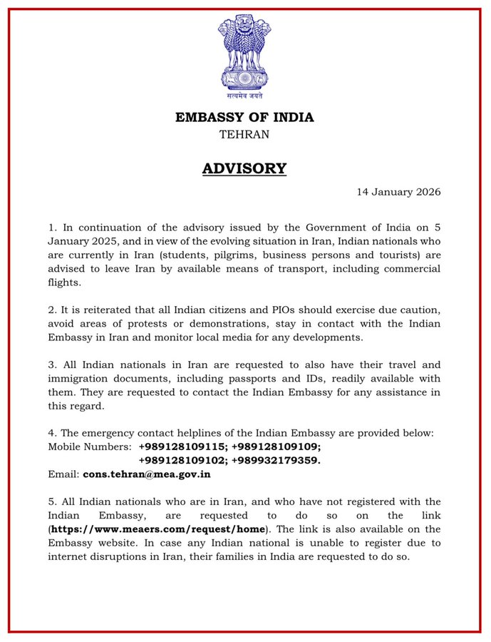 भारतीय दूतावास ने आपातकालीन हेल्पलाइन नंबर और ईमेल आईडी भी जारी की हैं, ताकि किसी भी संकट की स्थिति में तुरंत संपर्क किया जा सके। इसके अलावा, सरकार ने यह व्यवस्था भी की है कि अगर इंटरनेट बंद होने के कारण ईरान में मौजूद कोई भारतीय ऑनलाइन रजिस्ट्रेशन नहीं कर पा रहा है, तो भारत में बैठे उनके परिजन पोर्टल पर उनकी जानकारी दर्ज करा सकते हैं।