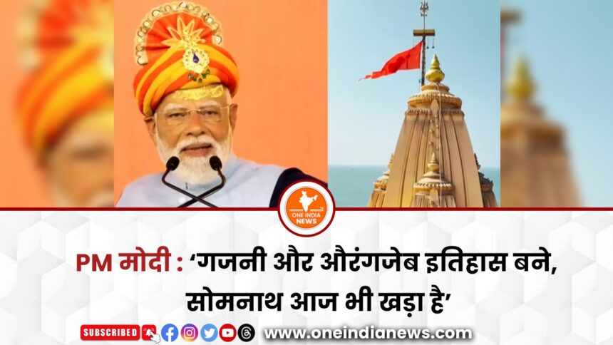 प्रधानमंत्री मोदी ने कहा कि गजनी से लेकर औरंगजेब तक जिन-जिन आक्रांताओं ने सोमनाथ पर हमला किया, वे यह समझते रहे कि उनकी तलवारें सनातन परंपरा को समाप्त कर देंगी। लेकिन वे यह नहीं समझ पाए कि सोमनाथ के नाम में ही ‘सोम’ यानी अमृत का भाव जुड़ा है, जिसमें हलाहल को पीकर भी अमर रहने की चेतना निहित है। उन्होंने कहा कि गजनी से औरंगजेब तक सभी आक्रांता इतिहास के चंद पन्नों में दफन हो गए, लेकिन चिर-चिरातन सोमनाथ मंदिर आज भी सागर तट पर उसी तरह अडिग खड़ा है।