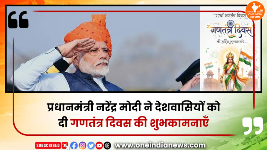 प्रधानमंत्री नरेंद्र मोदी ने 77वें गणतंत्र दिवस के अवसर पर देशवासियों को हार्दिक शुभकामनाएँ दीं। उन्होंने सोशल मीडिया मंच ‘एक्स’ (पूर्व में ट्विटर) पर संदेश जारी कर कहा कि भारत के आन-बान और शान का प्रतीक यह राष्ट्रीय महापर्व सभी के जीवन में नई ऊर्जा और नए उत्साह का संचार करे।