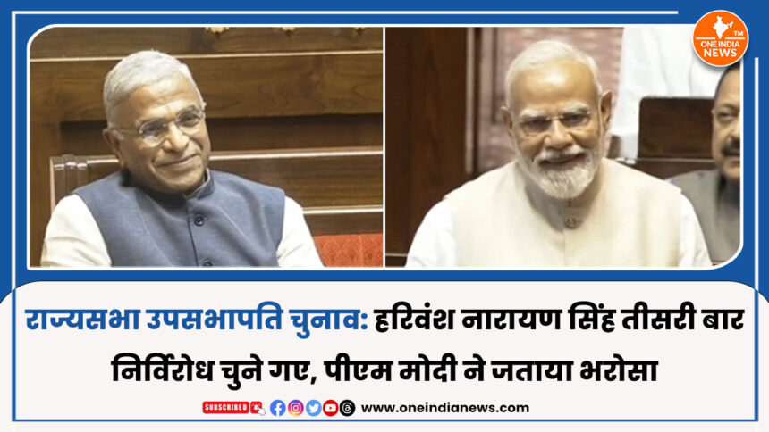 राज्यसभा में हरिवंश नारायण सिंह को लगातार तीसरी बार निर्विरोध उपसभापति चुना गया है। इस अवसर पर प्रधानमंत्री नरेंद्र मोदी ने उन्हें बधाई देते हुए उनके नेतृत्व और अनुभव की सराहना की।