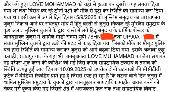 हालाँकि, पुलिस की दर्ज की गई FIR इस पूरे मामले की असली तस्वीर सामने लाती है। विवाद की शुरुआत 4 सितंबर को हुई, जब कानपुर के रावतपुर थाना क्षेत्र के सैयद नगर मोहल्ले में बारावफात की रोशनी के कार्यक्रम के दौरान मुस्लिम समुदाय ने सजावट के लिए ‘I Love Muhammad’ का लाइट बोर्ड लगाया। पुलिस की FIR में लिखा है कि ऐसा पहली बार हुआ और आयोजकों ने इसे एक नई परंपरा की तरह शुरू किया। स्थानीय लोगों ने आपत्ति जताई तो पुलिस ने समझौता करवाते हुए बोर्ड को थोड़ी दूरी पर लगवा दिया और मामला शांत हो गया। यानी इस स्तर पर विवाद खत्म हो गया था और बोर्ड वहाँ लगा हुआ था।