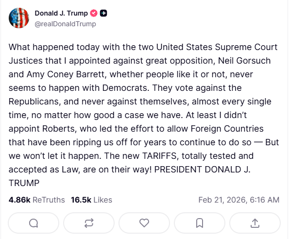 फैसले के तुरंत बाद ट्रंप ने ओवल ऑफिस से सभी देशों पर 10% वैश्विक टैरिफ लागू करने की घोषणा की। उन्होंने कहा कि यह टैरिफ लगभग तत्काल प्रभाव से लागू होगा।