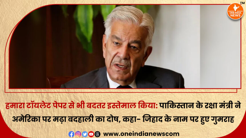 पाकिस्तान के रक्षा मंत्री ख्वाजा आसिफ ने देश की मौजूदा सामाजिक और आर्थिक स्थिति के लिए अमेरिका को जिम्मेदार ठहराते हुए कहा है कि पाकिस्तान को जिहाद के नाम पर गुमराह किया गया। संसद में दिए गए बयान में उन्होंने दावा किया कि अमेरिका ने पाकिस्तान का इस्तेमाल अपने हितों के लिए किया और बाद में उसे “टॉयलेट पेपर से भी बदतर” समझकर छोड़ दिया।